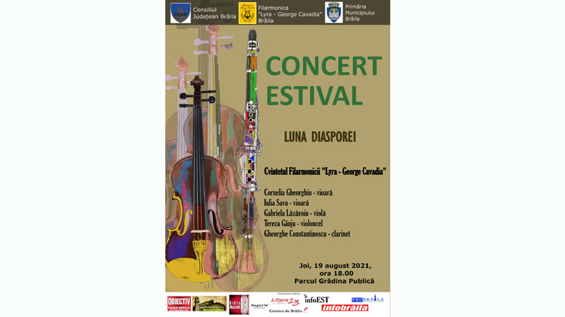 Joi, 19 august, de la ora 18.00, are loc în Grădina Publică din Brăila un nou concert estival marca Filarmonica "Lyra - George Cavadia", intitulat "Luna Diasporei". Vor evolua artiștii instrumentiști ai Cvintetului Filarmonicii "Lyra - George Cavadia" Brăila, binecunoscuți publicului iubitor de muzică cultă din orașul nostru: Cornelia Gheorghiu - vioară I, Iulia Sava - vioară II, Gabriela Lăzăroiu - violă, Tereza Gânju - violoncel și Gheorghe Constantinescu - clarinet.