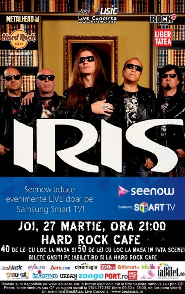 Legendara trupă rock Iris va susţine un concert în noua formulă pe 27 martie, în Hard Rock Cafe din Bucureşti. Evenimentul este programat să înceapă de la ora 21:00 şi se adresează tuturor fanilor grupului, indiferent de vârstă. Cei care nu vor reuşi să achiziţioneze bilete, vor putea urmări totuşi concertul pe Smart TV-urile Samsung, prin aplicaţia Seenow, pentru că show-ul va fi transmis live. Trupa Iris este una dintre cele mai îndrăgite grupuri de rock din România, cu o activitate muzicală de peste 35 de ani şi 19 materiale discografice lansate. După plecarea binecunoscutului vocal Cristi Minculescu, Iris cântă alături de Rafael, un rocker experimentat şi consacrat, cu o voce incredibilă. Alături de acesta, veteranii Nelu Dumitrescu (tobe), Valter Popa (chitară), Doru Borobeică (bass), Relu Marin (keyboards) vor interpreta pe 27 martie piese de legendă precum - "Somn Bizar", "Noaptea", "Să nu crezi nimic", "Ultimul mic dejun al lui Bon","Baby","Totul sau nimic" sau "De vei pleca".