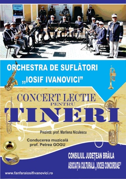 Tinerii brăileni, în mod special, şi comunitatea locală în general, au posibilitatea zilele acestea de a urmări o serie de concerte organizate de Consiliul Judeţean Brăila cu scopul de a-i atrage pe spectatori către muzica de bună calitate şi studierea instrumentelor muzicale specifice muzicii de fanfară. Totul se întâmplă în cadrul proiectului "Concert lecţie pentru tineri", finanţat de către CJ Brăila din fondurile alocate prin "Programul pentru finanţare nerambursabilă a activităţilor nonprofit de interes judeţean - cultură, sport pentru anul 2016" şi implementat de Asociaţia Culturală Voces Concordiae.