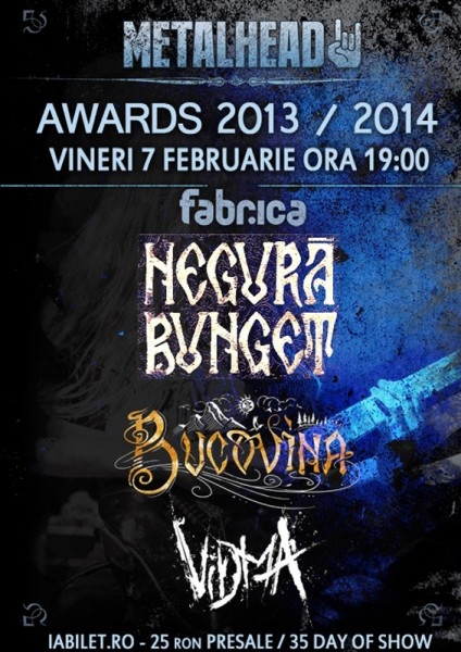 Două dintre cele mai importante trupe ale scenei metal din România, Negură Bunget şi Bucovina vor concerta pe 7 februarie în club Fabrica din Bucureşti. Este vorba despre cea de-a 7-a ediţie a "METALHEAD Awards" unde formaţiile desemnate câştigătoare în cadrul topului realizat recent de către site-ul de ştiri rock/metal metalhead.ro, vor fi premiate. Astfel, de la ora 19:00 vor urca pe scenă Vidma, câştigătoarea premiului Best Romanian Metal Newcomer 2013; Bucovina - Best Romanian Metal Band 2013 şi Best Romanian Metal Album 2013, iar cap de afiş va fi Negură Bunget - Best World Metal Band 2013. Biletele pentru eveniment au preţul de 25 de lei în presale până pe 6 februarie, iar în ziua concertului - 35 de lei. Acestea se găsesc deja spre vânzare pe www.iabilet.ro şi www.metalhead.ro/bilete/, unde se pot comanda atât bilete în format electronic cât şi în format fizic, cu plata ramburs sau prin OP.