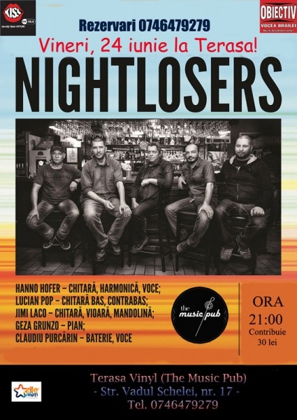 Trupa "Nightlosers" va susţine astăzi, începând cu ora 21.00, un concert la terasa The Music Pub de lângă Patinoar. Membrii formaţiei promit un spectacol de zile mari cu momente de rhythm & blues electric, tradiţional şi bluegrass.