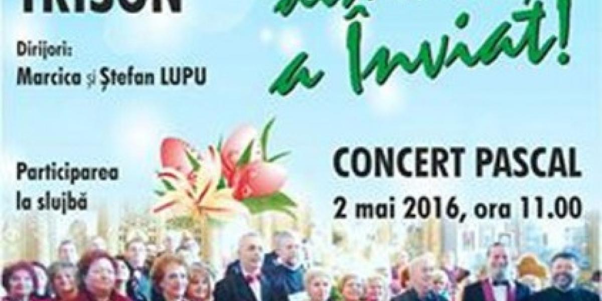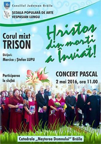 Luni, 2 mai 2016, de la ora 11.00, Corul mixt "Trison" al Şcolii Populare de Arte "Vespasian Lungu" va concerta la Catedrala "Naşterea Domnului" din Brăila.