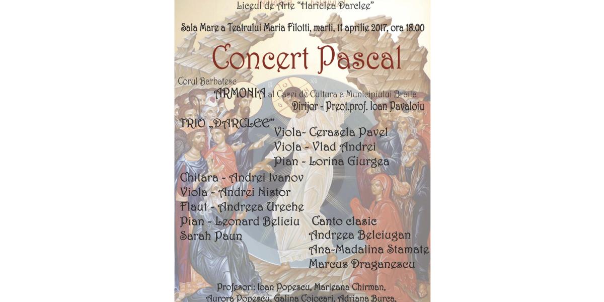 Marţi, 11 aprilie, începând cu ora 18.00, în Sala Mare a Teatrului “Maria Filotti” va avea loc un Concert extraordinar, prilejuit de apropierea marii sărbători creştine a Învierii Domnului. Manifestarea este organizată de Casa de Cultură a Municipiului Brăila şi Liceul de Arte “Hariclea Darclee”. Concertul pascal va fi susţinut de: Corul Bărbătesc “Armonia”, dirijor preot prof. Ioan Păvăloiu, Trio Darclee, format din Cerasela Pavel – violă, Vlad Andrei – violă, Lorina Giurgea – pian. Vor fi prezenţi instrumentiştii Andrei Ivanov – chitară, Andrei Nistor – violă, Andreea Ureche – flaut, Leonard Beliciu –pian, Sarah Păun – pian şi soliştii: Andreea Belciugan, Ana-Mădălina Stamate şi Marcus Drăgănescu. Profesori îndrumători ai acestui spectacol sunt: Ioan Popescu, Marieana Chirman, Aurora Popescu, Galina Cojocari, Adriana Burcă, Marius Şerban, Cerasela Omocea, Liliana Chiriţă şi Raluca Ciucă.