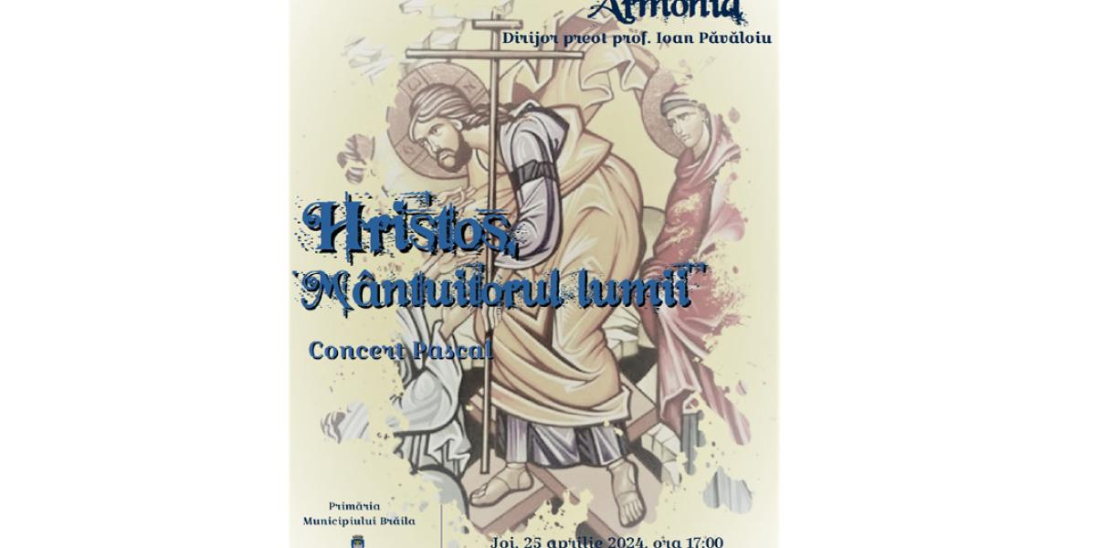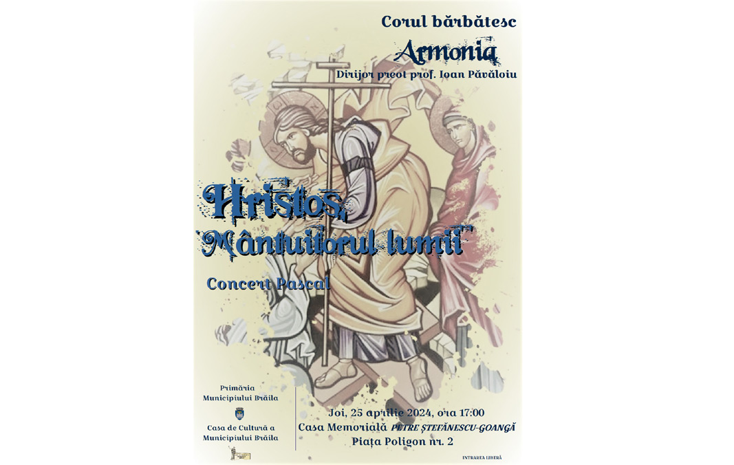 Casa de Cultură a Municipiului și Primăria Municipiului Brăila îi invită pe brăilenii de toate vârstele la Concertul extraordinar „Hristos, Mântuitorul lumii”, prilejuit de apropierea marii sărbători creştine a Învierii Domnului. Manifestarea, de o mare însemnată culturală și religioasă deopotrivă, va avea loc joi, 25 aprilie, începând cu ora 17.00, la Casa Memorială „Petre Ștefănescu-Goangă” (Piața Poligon nr. 2). Concertul pascal va fi susţinut de Corul Bărbătesc Armonia, dirijor preot prof. Ioan Păvăloiu.