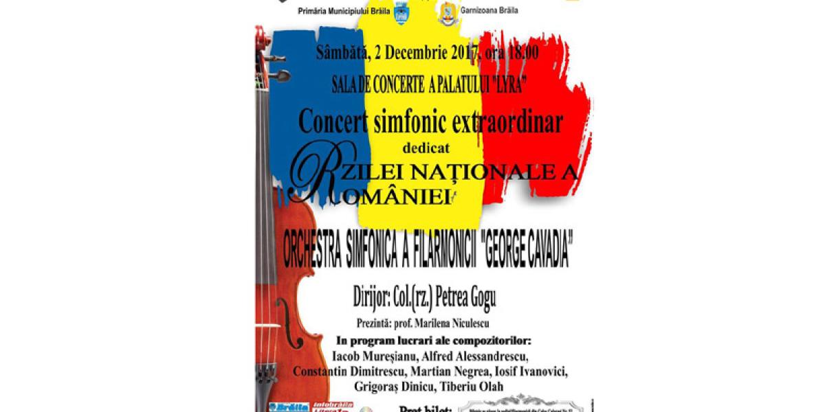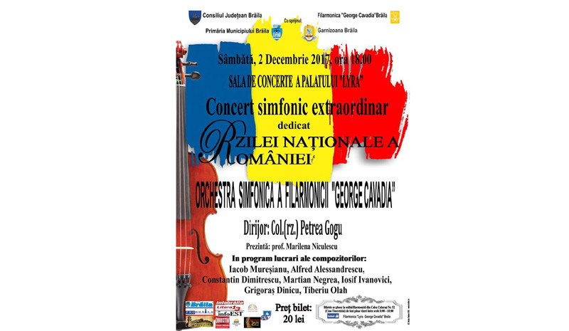 Sâmbătă, 2 decembrie 2017, ora 18.00, în Sala de Concerte a Palatului “Lyra”, Orchestra Simfonică a Filarmonicii „Lyra-George Cavadia” va susţine un Concert Extraordinar dedicat ZILEI NAŢIONALE A ROMÂNIEI.