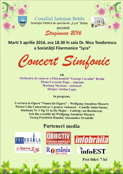 Marţi, 5 aprilie 2016, de la orele 18.00, în Sala de spectacole a Palatului Lyra va avea loc "Concertul Simfonic" al Orchestrei de Cameră a Filarmonicii "George Cavadia" Brăila, sub bagheta dirijorului Ştefan Lupu.