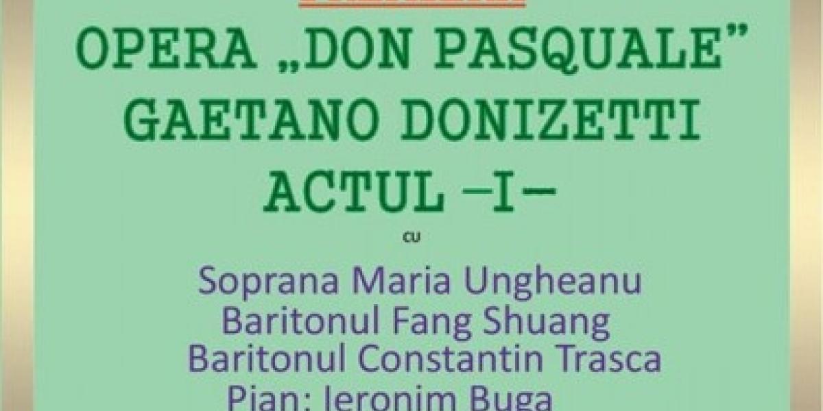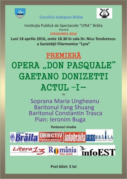 Luni, 18 aprilie 2016, orele 18.30, în Sala de Concerte a Societăţii Filarmonice LYRA are loc premiera Actului I din Opera "Don Pasquale" - Gaetano Donizetti, având ca protagonişti pe soprana Maria Ungheanu, baritonul Fang Shuang, baritonul Constantin Traşcă, acompaniaţi la pian de Ieronom Buga. La concertul de luni, baritonul Constantin Traşcă va mai interpreta Aria "Non piu andrai" din opera "Nunta lui Figaro" de Mozart şi Aria "Madamina" din opera lui "Don Giovanni" de Mozart.