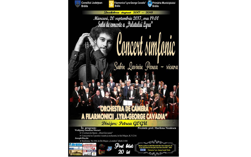 Filarmonica “Lyra-George Cavadia” Brăila, Consiliul Judeţean Brăila şi Primăria Municipiului Brăila, oferă publicului iubitor al muzicii clasice, un concert simfonic de deschidere a stagiunii 2017-2018. Evenimentul va avea loc miercuri, 20 septembrie, începând cu ora 19:00, în Sala de Concerte a Palatului “Lyra”, iar invitat de onoare este violonistul Sabin-Lavinin Penea, licenţiat şi absolvent de masterat sub îndrumarea maestrului Gabriel Croitoru, cu o paletă largă de competiţii, recitaluri şi concerte susţinute atât în ţară, cât şi peste hotare. Alături de invitaţi va fi Orchestra de Cameră a filarmonicii “Lyra-George Cavadia” Brăila, dirijată de maestrul Petrea Gogu, iar prezentarea evenimentului va fi realizată de profesor Marilena Niculescu.