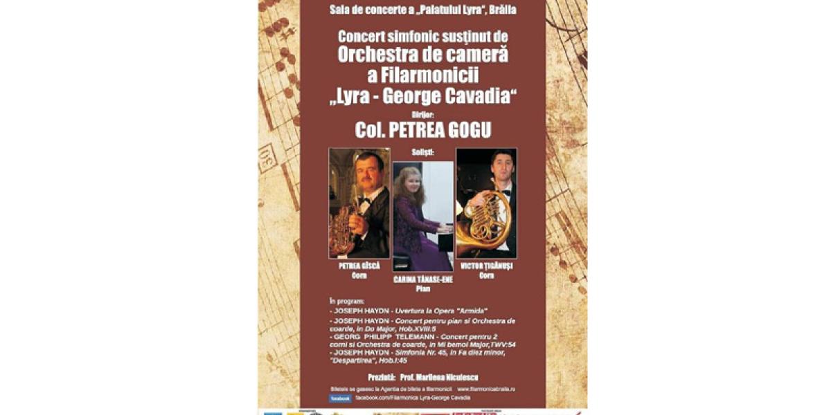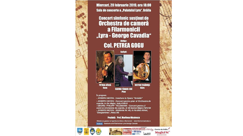 Filarmonica “Lyra-George Cavadia” Brăila organizează miercuri, 20 februarie 2019, cu începere de la ora 18:00, în Sala de Concerte “Doctor Nicu Teodorescu” a Palatului “Lyra” un Concert simfonic susţinut de Orchestra de Cameră a filarmonicii, dirijată de colonel Petrea Gogu.