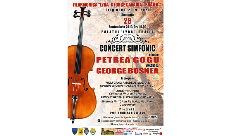 Sâmbătă, 28 septembrie 2019, de la ora 19:00, în Sala de Concerte “Dr. Nicu Teodorescu” din Palatul “Lyra”, Filarmonica “Lyra-George Cavadia” Brăila deschide stagiunea 2019 - 2020, cu un Concert Simfonic Extraordinar, sub bagheta dirijorală a col Petrea Gogu. Evenimentul va fi prezentat de profesor Marilena Niculescu şi îl are ca invitat pe violoncelistul GEORGE BOSNEA, de la Filarmonica Bacău.