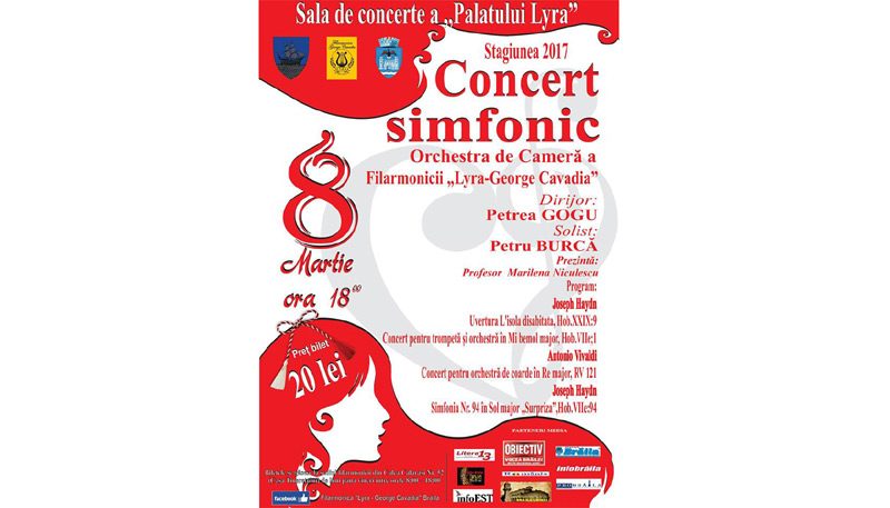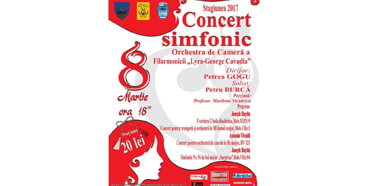 Miercuri, 8 martie 2017, începând cu ora 18.00, în Sala de Concerte a Palatului LYRA va avea loc Concertul Simfonic, dedicat Zilei Internaţionale a Femeii, în interpretarea orchestrei de cameră a filarmonicii brăilene, dirijată de maestrul Petrea Gogu. Manifestarea este organizată de Consiliul Judeţean Brăila, prin Filarmonica “Lyra-George Cavadia”, cu sprijinul Primăriei Municipiului Brăila pentru publicul iubitor de muzică. Prezentarea va fi realizată de profesor Marilena Niculescu.