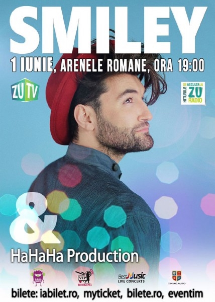 Celebrul artist român Smiley va concerta pe 1 iunie la Arenele Romane din Bucureşti în cadrul unui eveniment după un concept propriu. Acesta va urca pe scenă alături de mai mulţi interpreţi în vogă, show-ul marcând finalul campaniei HaHaHa Production prin care, zilnic, în luna mai se lansează câte o piesă nouă. Primii invitaţi speciali ai serii de 1 iunie sunt: Feli, Jazzy Jo, Silviu Pască, Peter Pop şi Sore. De precizat că se va cânta cu live band (chitară, bass, tobe, clape). Potrivit organizatorilor, încă o serie de invitaţi vor fi anunţaţi în curând. "31 de piese în 31 de zile, 16 artişti, două cd-uri, #maimusic. Nu ţin cont de reguli sau trenduri şi creăm în timp real, piesă cu piesă, zi de zi, cea mai înnoitoare compilaţie muzicală românească, pe care o lansează la sfârşitul lunii. Muzică în stare pură, exact cum o simt ei: mai nouă, mai multă, mai spontană, mai adevărată, mai liberă - #maimusic", anunţă un comunicat recent de presă al HaHaHa Production. De reţinut că biletele VIP sunt deja sold out iar la categoria A mai sunt disponibile doar câteva bucăţi.