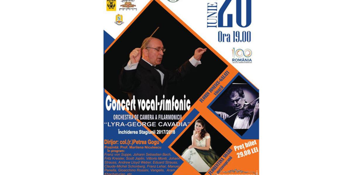 • Filarmonica “Lyra-George Cavadia” Brăila încheie stagiunea 2017-2018 cu un Concert vocal-simfonic de excepţie, care va avea loc miercuri, 20 iunie, cu începere de la ora 19.00, în Sala Mare a Teatrului “Maria Filotti”