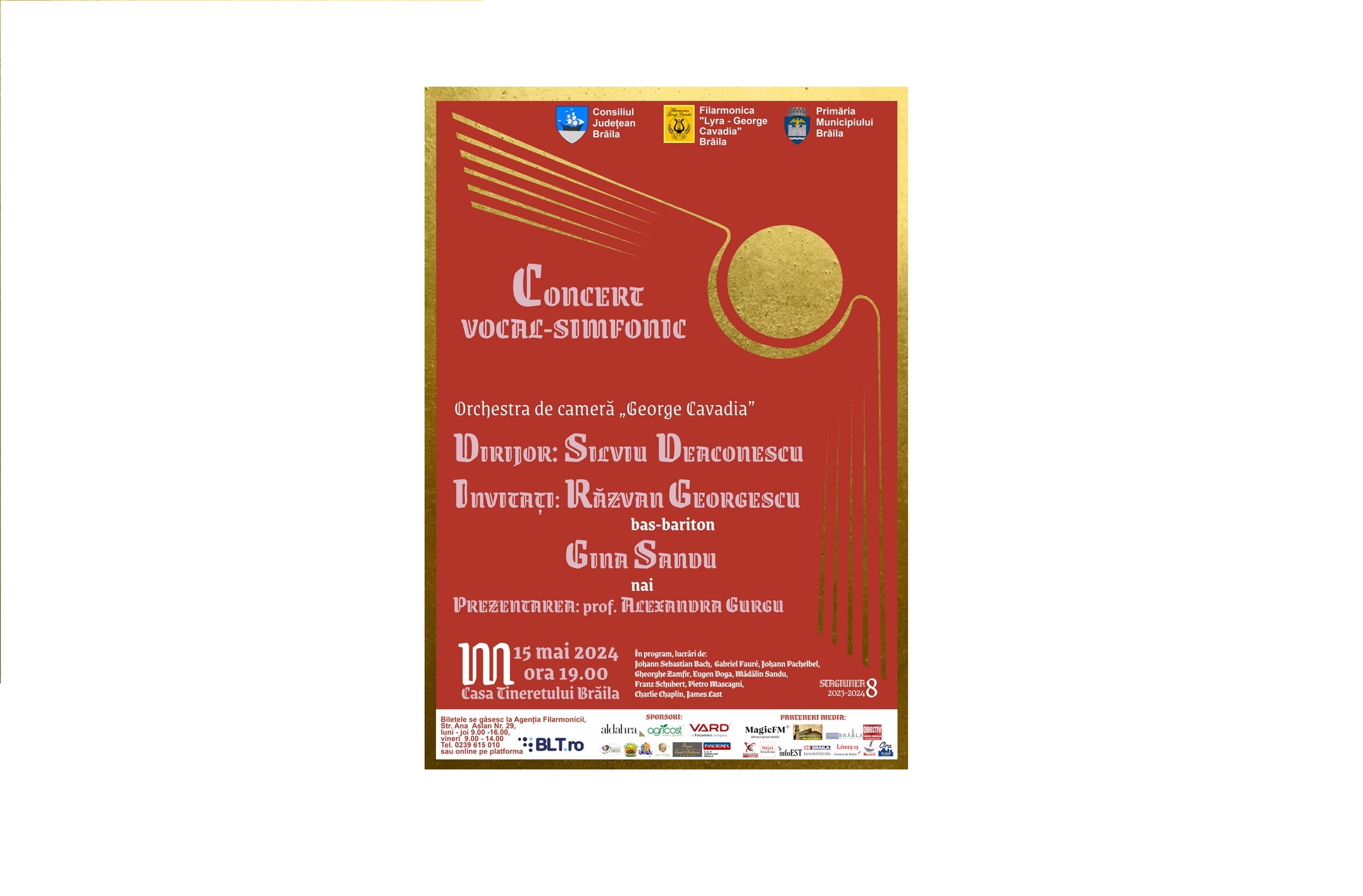 Filarmonica „Lyra - George Cavadia”, în parteneriat cu Consiliul Județean Brăila și Primăria Municipiului Brăila organizează miercuri, 15 mai, ora 19.00, la Casa Tineretului, un Concert vocal-simfonic susținut de Orchestra de Cameră „George Cavadia”, dirijată de Silviu Deaconescu. Prezintă prof. Alexandra Gurgu, secretar muzical al Filarmonicii „Lyra - George Cavadia” Brăila. Biletele pentru concert se pot achiziționa de la Agenția Filarmonicii „Lyra - George Cavadia”, Strada Ana Aslan nr. 29, Brăila, sau online, de pe platforma BLT.ro.
