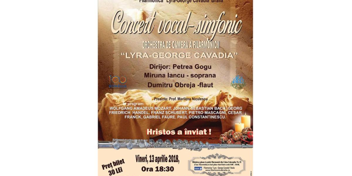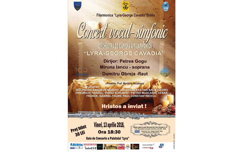 Vineri, 13 aprilie 2018, de la ora 18.30, la Sala de Concerte a Palatului LYRA va avea loc un concert vocal-simfonic susţinut de Orchestra de Cameră a Filarmonicii “LYRA-GEORGE CAVADIA”, sub bagheta dirijorului Petrea Gogu. Invitaţi speciali: soprana MIRUNA IANCU şi DUMITRU OBREJA - flaut.