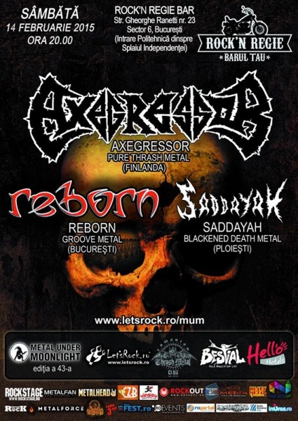 Concertul trupei finlandeze de thrash Axegressor ce va avea loc pe 14 februarie în Bucureşti, în cadrul celei de-a 43-a ediţie "Metal Under Moonlight" a suferit mici modificări de ordin organizatoric. Show-ul nu va mai avea loc în Club La Piraţi, aşa cum era stabilit iniţial, ci în clubul Rock n Regie. Potrivit organizatorilor, rezervările făcute pentru fosta locaţie rămân însă valabile, la fel ca şi restul detaliilor evenimentului. Astfel, reamintim că alături de Axegressor (pure thrash metal din Finlanda), pe scenă vor urca Reborn (groove metal din Bucureşti) şi Saddayah (blackened death metal din Ploieşti). Show-ul va avea loc sâmbătă, 14 februarie, cu începere de la ora 20:00, iar preţul unui bilet este de 20 lei. Clubul Rock n Regie se află pe Str. Gheorghe Ranetti nr. 23, Sector 6, Bucureşti.