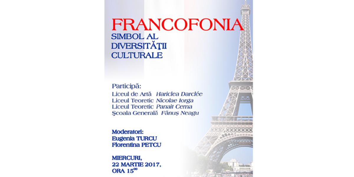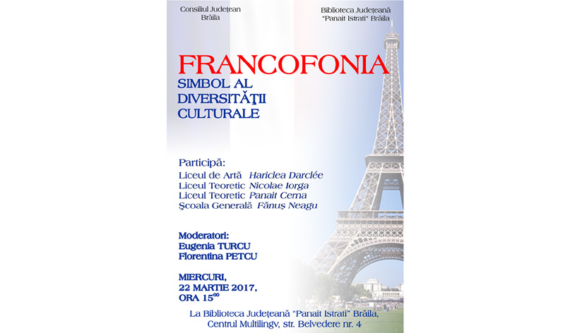 Miercuri, 22 martie 2017, de la ora 15.00, la Biblioteca Judeţeană “Panait Istrati” Brăila se desfăşoară Concursul şcolar “Francofonia – simbol al diversităţii”, eveniment care are ca obiectiv promovarea fondului de carte de la Secţia Franceză. Totodată, evenimentul coordonat de bibliotecarii Eugenia Turcu şi Florentina Petcu, le oferă elevilor posibilitatea de a afla mai multe informaţii despre cultura şi civilizaţia franceză şi un cadru non-formal, diferit de şcoală, unde pot interacţiona şi comunica în cadrul unei competiţii.