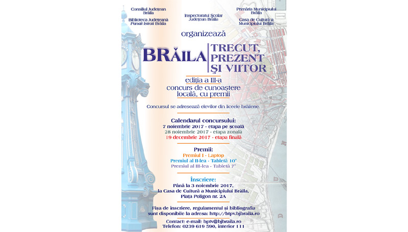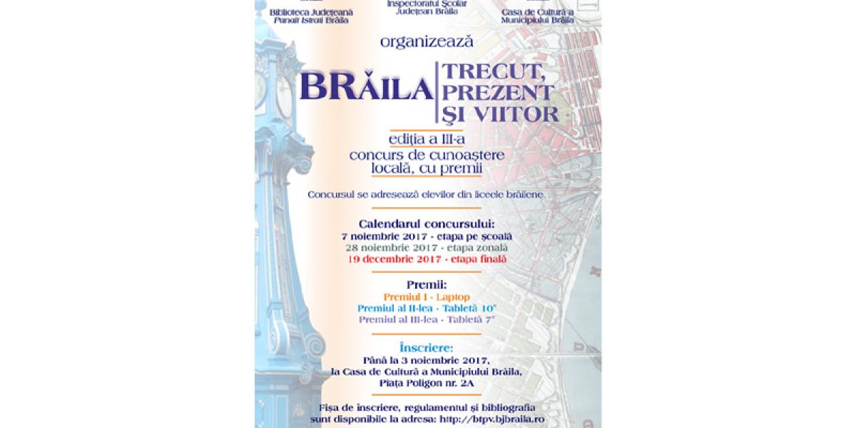 Consiliul Judeţean Brăila, Primăria Municipiului Brăila, prin instituţiile sale, Biblioteca Judeţeană “Panait Istrati” şi Casa de Cultură a Municipiului, în colaborare cu Inspectoratul Şcolar Judeţean Brăila, organizează, până pe data de 19 decembrie 2017, Concursul de cunoaştere locală “BRĂILA - TRECUT, PREZENT ŞI VIITOR”, ediţia a III-a. Concursul este organizat în toate liceele de pe teritoriul judeţului Brăila, pentru elevii din clasele IX – XII (15-19 ani). Înscrierile se vor face până la data de 3 noiembrie, la sediul Casei de Cultură a Municipiului Brăila. Participanţii se vor grupa în echipe formate din trei persoane. În momentul înscrierii, echipelor li se va comunica şi centrul unde vor participa la concurs în cazul calificării în etapa zonală.