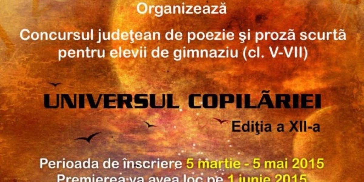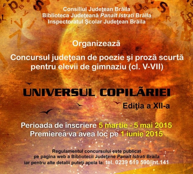 La Biblioteca Judeţeană s-a lansat cea de-a XII-a ediţie a Concursului judeţean de creaţie literară "Universul copilăriei". Pot participa elevi de gimnaziu la cele două secţiuni: poezie şi proză scurtă. Criteriile după care vor fi evaluate lucrările sunt: creativitate, originalitate, idee, calitate şi estetică. Pentru a fi acceptate în concurs, lucrările trebuie să fie originale şi să nu fi fost publicate niciodată. Participanţii au dreptul de a se înscrie în concurs cu o singură lucrare la fiecare secţiune. Acestea vor fi însoţite de o fişă cu datele personale ale autorului: nume, prenume, şcoala de provenienţă, clasa, profesorul îndrumător, adresa de e-mail/ telefonul elevului şi al profesorului, precum şi alte informaţii necesare. În plus, lucrările înscrise trebuie să respecte legea drepturilor de autor, drepturile de proprietate intelectuală, iar participantul trebuie să fie proprietarul tuturor drepturilor asupra creaţiilor înscrise în concurs. Participanţii au libertatea de a-şi alege singuri tema. Compoziţiile vor fi trimise în format electronic la adresele de email: danbistri1@gmail.com sau ionvolku@yahoo.com. Textele vor fi redactate în Word, Times New Roman, corp de literă 12, la 1 ½ rânduri, neapărat cu diacritice.