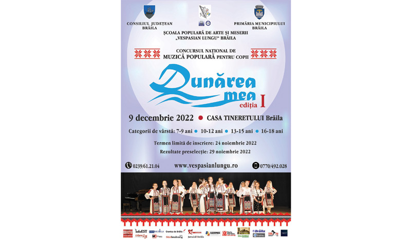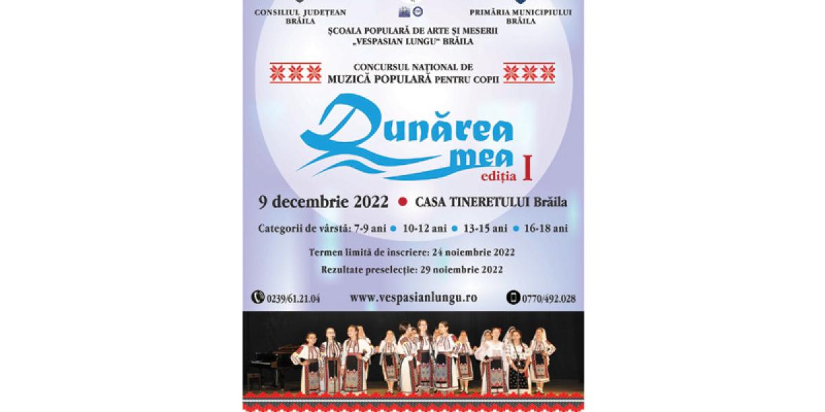 Iată de ce Școala Populară de Arte și Meserii „Vespasian Lungu” Brăila a decis ca, din acest an, să organizeze prima ediție a Concursului Național de Muzică Populară pentru Copii „Dunărea mea”, care se adresează copiilor din tară și din Republica Moldova. Juriul este format din personalități, interpreți și specialiști de marcă ai muzicii populare românești contemporane. De menționat că acest concurs este cuprins în Proiectul Managerial și în Agenda Culturală a Județului Brăila pe anul 2022.