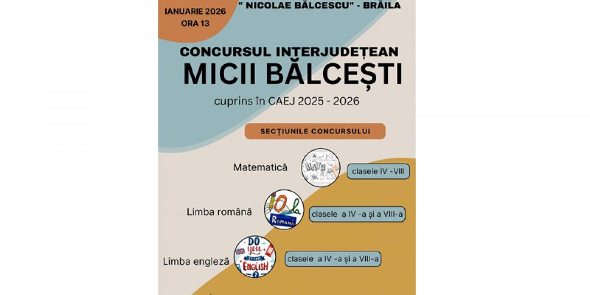 • aproximativ 450 de elevi din șase județe ale țării vor participa vineri, 16 ianuarie, începând cu ora 13:00, la Concursul interjudețean ”Micii Bălcești”, ediția a III-a, organizat de Colegiul Național ”Nicolae Bălcescu” din Brăila, competiție care se desfășoară la disciplinele Limba română, Matematică și Limba engleză