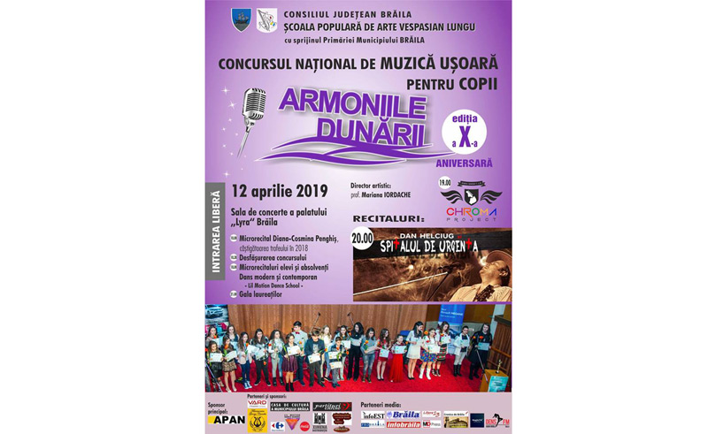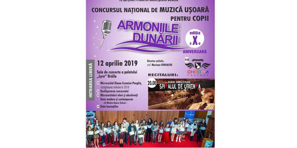 Vineri, 12 aprilie 2019, începând cu ora 10.00, în Sala de concerte a Palatului “Lyra” din Brăila se va desfăşura cea de-a zecea ediţie, aniversară, a Concursului Naţional de Muzică Uşoară pentru Copii “ARMONIILE DUNĂRII”.