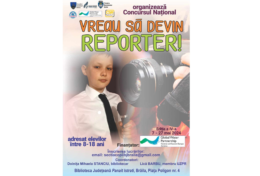 Biblioteca Județeană ”Panait Istrati” Brăila, Secția de Împrumut pentru copii. Ludotecă, în colaborare cu Asociația Parteneriatul Global al Apei din România, vă invită la o nouă provocare: Concursul Național „Vreau să devin reporter!”. Ajunsă la a IV-a ediție, competiția se adresează elevilor cu vârste între 8 și 18 ani și cuprinde trei secțiuni: reportaje video, reportaje audio și reportaje scrise.