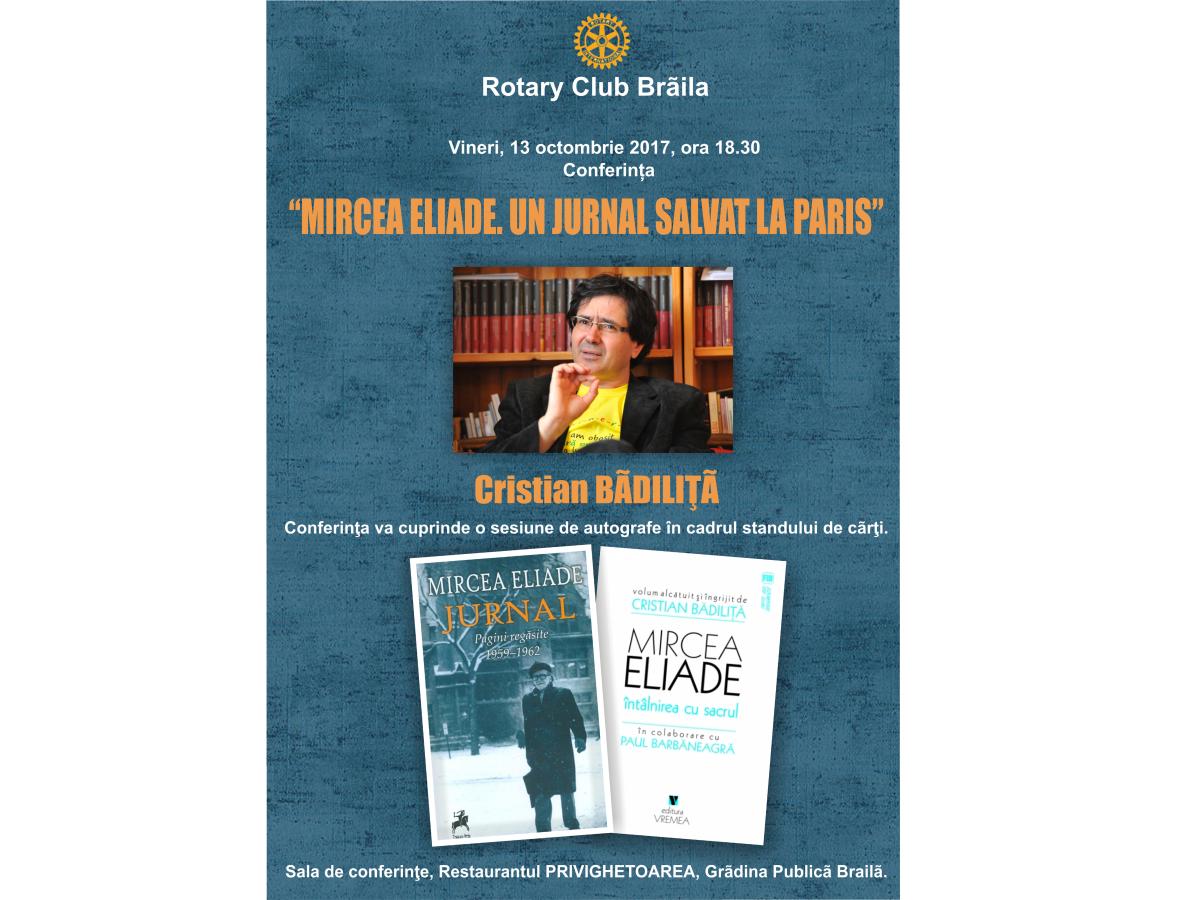 Cu prilejul împlinirii a 110 ani de la naşterea lui Mircea Eliade, mâine, la ora 18.30, în Sala de conferinţe a restaurantului Privighetoarea, va avea loc o conferinţă “Mircea Eliade. Un jurnal salvat la Paris”, unde Cristian Bădiliţă va depăna povestea salvării unui fragment important din Jurnalul celebrului scriitor-savant.