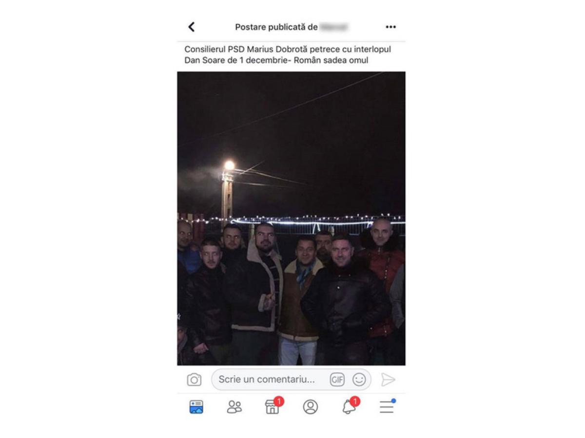 Gest sfidător pe Facebook al unui PSD-ist, taxat de brăileni. Consilierul judeţean Marius Dobrotă s-a pozat pe 1 Decembrie cu un cunoscut al lumii interlope din Brăila, Marian Dănuţ Soare, iar apoi a urcat fotografiile pe reţelele de socializare, nestingherit. “Mutarea” nu a fost deloc privită cu ochi buni de către unii brăileni, care au distribuit fotografiile lui Dobrotă pe mai multe grupuri locale ale Facebook şi chiar au făcut sesizări pe adresa cotidianului “Obiectiv - Vocea Brăilei”, vorbind despre legături clare între “PSD şi interlopi”.