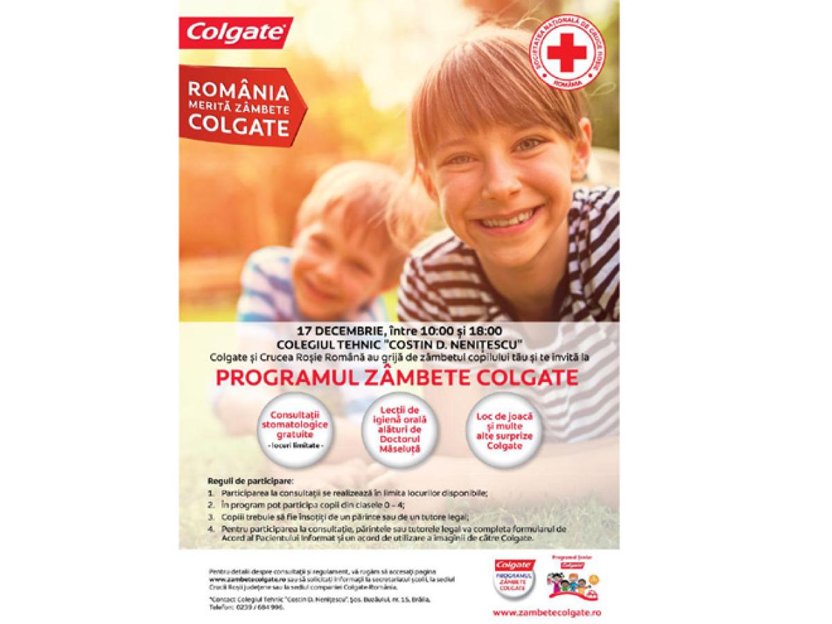 Elevii din clasele 0-IV din cadrul tuturor şcolilor din municipiul şi judeţul Brăila vor beneficia, gratuit, de consultaţii stomatologice, acţiunea făcând parte din programul “Zâmbete Colgate”, iniţiat de “Colgate” în parteneriat cu filialele de Cruce Roşie. Pe lângă consultaţii, copiii vor avea parte de lecţii de igienă orală, oferite de voluntarii Crucii Roşii. Au fost alese două locaţii pentru această activitate: Colegiul Naţional “Gheorghe M. Murgoci” - pentru ziua de 16 decembrie, şi Colegiul Tehnic “Costin D. Neniţescu” - pentru ziua de 17 decembrie, în intervalul orar 10.00 – 18.00.