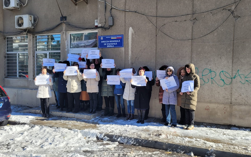 • declanșat pe 23 noiembrie, protestul salariaților DRS Brăila se bucură de sprijinul Sindicatului din Institutul Național de Statistică București • „Protestul va continua în fiecare zi, pe perioadă nedeterminată, până când revendicările noastre vor fi soluționate”, precizează inițiatorii acțiunii • statisticienii amenință că vor întrerupe activitatea, că nu vor mai colecta date și că nu vor participa la organizarea alegerilor de anul viitor