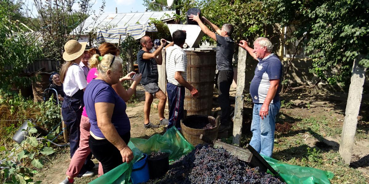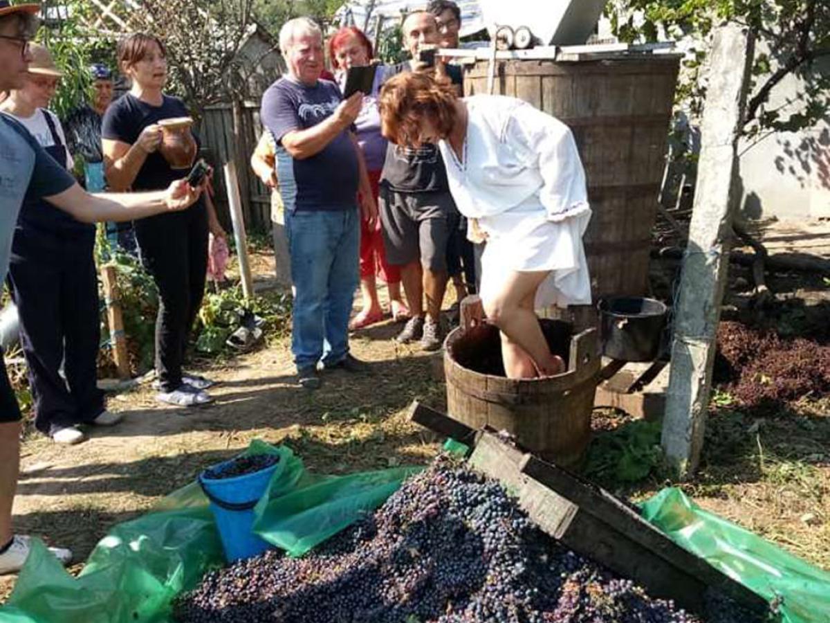 Ştergându-şi satisfăcuţi sudoarea de pe frunte, turiştii-vizitatori s-au aşezat la masă, fiind serviţi cu borş de pasăre şi sărmăluţe în foi de viţă. După prânz, a fost programată faza a doua a programului de muncă, şi anume mustitul. Sătui şi oarecum toropiţi de căldura amiezei, turiştii s-au urnit mai greu să participe la zdrobitul strugurilor, însă până la urmă treaba a mers ca unsă, iar când o doamnă îmbrăcată în cămaşă de pânză cu motive tradiţionale s-a oferit să calce strugurii cu picioarele goale, aşa cum se proceda acum o sută de ani, aplauzele şi chiotele de veselie au umplut văzduhul, de jur împrejurul gospodăriei.