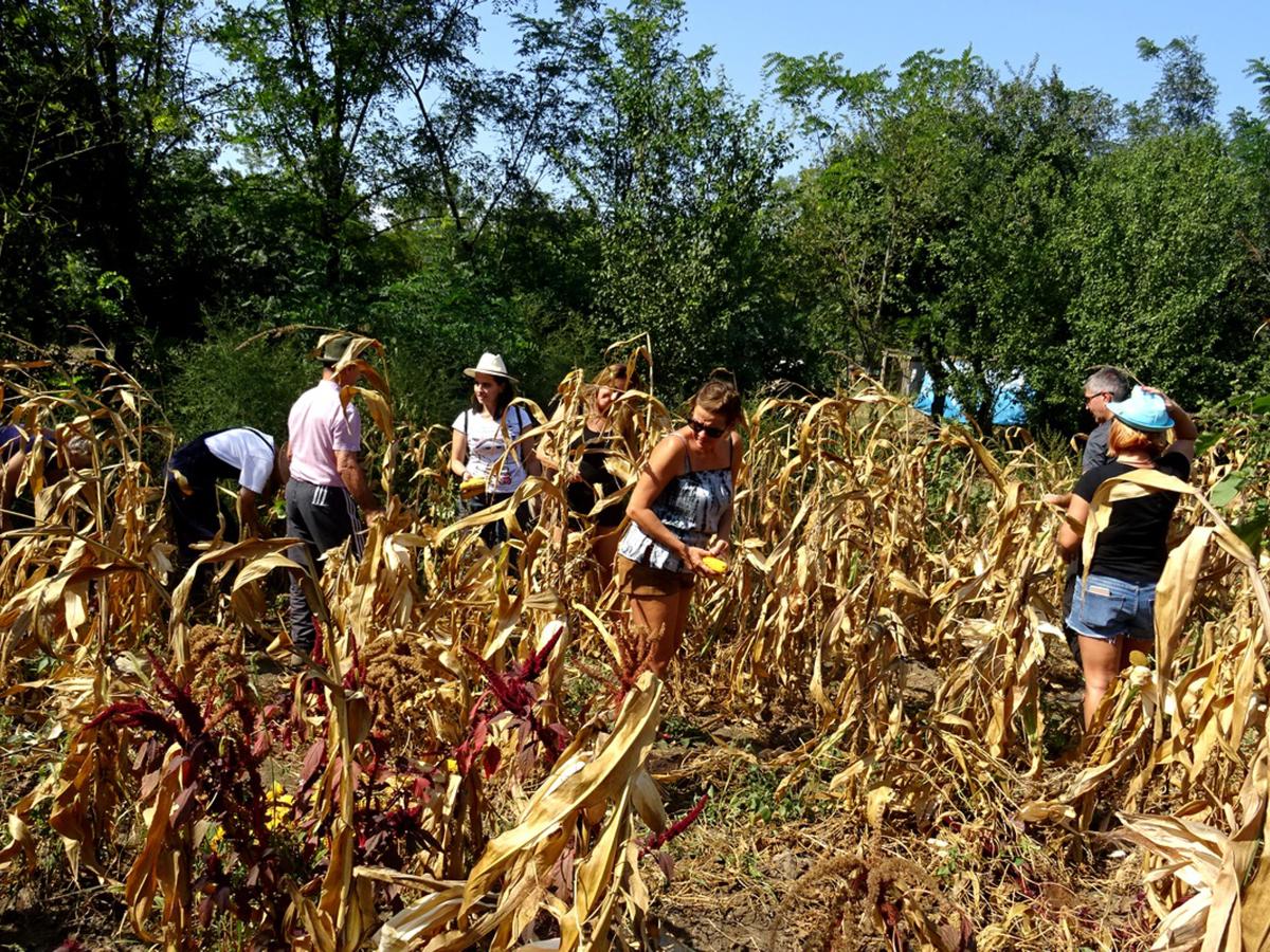 Mai nou, inimoasele doamne încearcă să facă din comuna lor o destinaţie turistică la fel de căutată ca Viscri sau alte sate deja celebre din Ardeal, Banat, Oltenia sau Moldova. “Am vizitat Viscri şi am văzut cât de mult sunt atraşi oamenii de frumuseţile locului dar şi de obiceiuri şi tradiţii. Ne întrebam cu ce ar putea veni deosebit satul nostru, Mircea Vodă, iar din discuţiile cu localnicii am aflat că la ei nu prea sunt plantaţii de vie ca la noi, cel puţin nu atât de mari. Când le-am povestit despre culesul viei toamna, ne-au spus că acolo nu au această tradiţie. Aşa ne-a venit ideea de a face o acţiune de cules de struguri la care să invităm turişti interesaţi să vadă cum decurge o astfel de activitate în Bărăgan”, ne-a povestit Cornelia Presadă, bibliotecara comunei Mircea Vodă şi membru de bază al grupului de iniţiativă din localitate. La sfârşitul săptămânii trecute, în gospodăria Corneliei Presadă s-a desfăşurat evenimentul “La cules în Mircea Vodă: un sat din Bărăgan”. Promovat pe reţelele de socializare de Asociaţia EduCaB, acest eveniment, ce poate fi privit ca un proiect-pilot a ceea ce ar putea urma pe viitor, a adunat circa 15 participanţi. Unii dintre aceştia au legătură cu EduCaB sau cu Trustul Mihai Eminescu, o altă asociaţie care activează pentru promovarea turismului rural, alţii au venit pur şi simplu după ce au văzut anunţul de pe Facebook. Contra unor tarife modice, participanţii au fost cazaţi în casele localnicilor şi au primit mic dejun, prânz şi cină cu mâncăruri ecologice, preparate de gospodinele din Grupul de Iniţiativă Mircea Vodă. Sâmbătă, 15 septembrie, ei au participat la culesul viei - motivul pentru care au ajuns, de fapt, acolo. A fost culeasă, însă, doar via din curtea Corneliei Presadă, formată din câteva rânduri întinse pe circa 50 de metri lungime. O suprafaţă prea mică pentru atâta forţă de muncă! Deşi neexperimentaţi, turiştii au dat gata mica plantaţie de viţă de vie în nici o oră şi jumătate, şi mulţi dintre ei ar fi vrut să mai aibă ce culege, dacă tot au venit să simtă pe proprie piele cum decurge o astfel de activitate. Gazdele le-au explicat, însă, că deocamdată via din câmp nu s-a copt suficient, deci momentan trebuie să se mulţumească doar cu mica porţie de muncă de care au avut parte. Cum încă nu venise ora prânzului, turiştii au fost invitaţi la un pahar de vorbă şi de vişinată, la umbra unui nuc din grădină. Acolo au pus ţara la cale preţ de vreo oră, iar pentru că încă nu dispăruse cheful de muncă au pus ochii pe cele câteva rânduri de porumb aflate lângă viţa de vie. “Să culegem şi porumbul!”, a propus cineva, iar gospodarii-gazdă au primit ideea cu bucurie. Aşa se face că, în nici 20 de minute, ştiuleţii de porumb de pe micul lot erau deja culeşi şi duşi în porumbar.