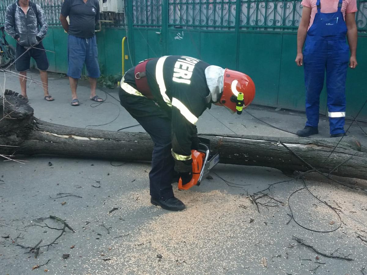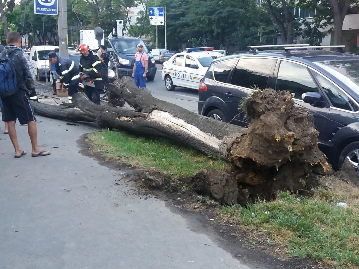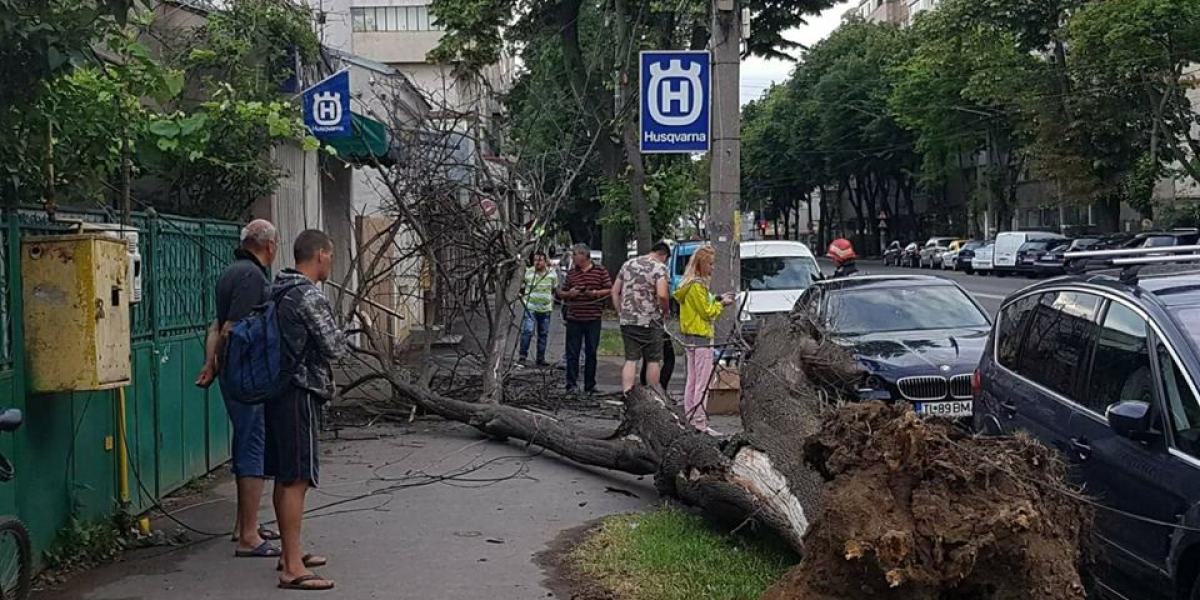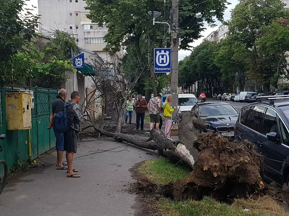 Un copac uscat s-a prăbușit în această seară pe bulevardul Dorobanților, între Str. Gral. Eremia Grigorescu și Str. Apollo, avariind un autoturism BMW și rupând mai multe fire de cablu TV și internet. Un echipaj ISU a intervenit pentru degajarea zonei. De asemenea, un echipaj de la Electrica a sosit la fața locului pentru a se asigura că nu sunt afectate și cablurile de electricitate.