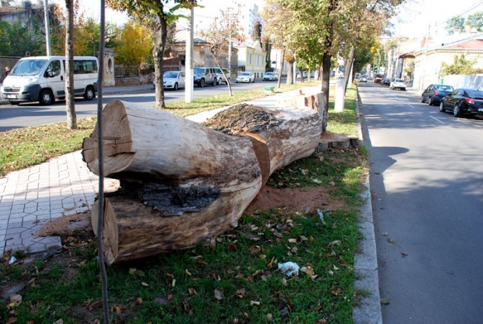 Şase copaci de pe bulevardul Cuza au fost doborâţi la pământ de angajaţii "Seroplant" Brăila, pe parcursul săptămânii trecute. Bucăţi din trunchiurile masive ale câtorva dintre ei încă se mai află pe spaţiul verde al bulevardului, la câteva zile după ce s-a făcut tăierea. Conducerea "Seroplant" spune că nu s-a putut elibera zona corespunzător din cauza faptului că trunchiurile respective sunt pline de cuie şi bucăţi de sârmă şi nu pot fi tăiate cu drujba. "În lemn se află foarte multe bucăţi de metal şi efectiv nu putem folosi drujba, să mărunţim acei buşteni pentru a-i încărca într-un camion. În această situaţie, avem nevoie de o macara, iar momentan macaraua de la «Braicar» are nişte defecţiuni tehnice. Când va fi reparată macaraua, vom căra acei buşteni, apoi vom scoate şi rădăcinile, ca să putem planta alţi arbori în loc", ne-a explicat Ligia Drăgan, directorul "Seroplant". Potrivit acesteia, copacii respectivi au fost tăiaţi pentru că erau şubrezi şi nu mai prezentau siguranţă.