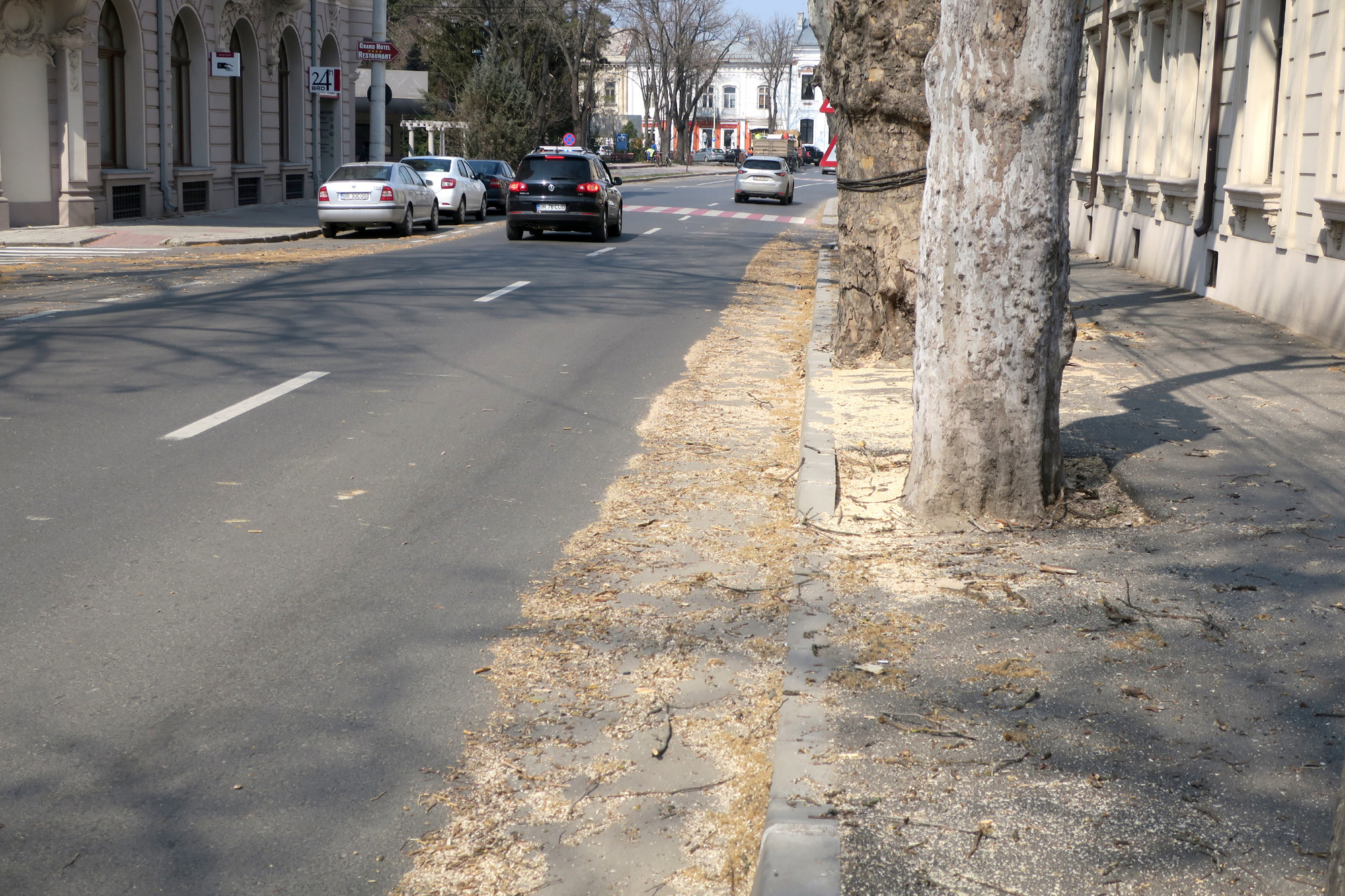 Echipele de lucru ale Serviciului ”Seroplant” din cadrul Primăriei Brăila au toaletat, ieri, coroanele mai multor arbori de mari dimensiuni de pe Calea Călărașilor și din Piața Traian. Acțiunea se încadrează în lucrările executate în mod curent în această perioadă a anului, astfel de operațiuni fiind făcute și în alte zone din municipiu. Este de remarcat, însă, modalitatea de lucru a celor de la Seroplant: taie crengile, pe cele mari le încarcă într-o remorcă pentru a fi folosite ca lemne de foc, iar pe cele mici le toacă la fața locului, cu un utilaj special. Toate bune și frumoase, numai că de rumeguș și de celelalte resturi nu se ocupă nimeni la aceeași oră, urmând ca măturarea carosabilului și a trotuarelor să se facă mai târziu în aceeași zi sau chiar în zilele următoare. Așa se face că, ieri, în jurul orei 14.00, pe trotuarele de pe Calea Călărașilor, în zona Bisericii Grecești, se circula pe un strat gros de rumeguș, pe care vântul îl împrăștia în toate direcțiile. Aceeași situație și în Piața Traian, totul lăsând impresia unui oraș murdar și prost gospodărit!