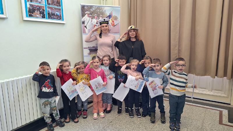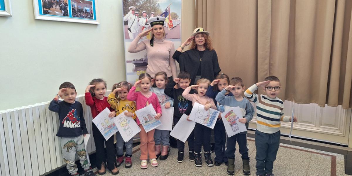• weekendul trecut, micuții de la grupa mijlocie „Albinuțele” a Grădiniței „Luceafărul”, însoțiți de doamnele educatoare, au vizitat Sala de Tradiții a Comandamentului Flotilei Fluviale „Mihail Kogălniceanu” • cei mici au fost fascinați de machetele de nave, de aparatura folosită, de decorații și de uniforme • la finalul vizitei, au realizat desene cu marinari și vapoare și au primit daruri dintr-un cufăr misterios