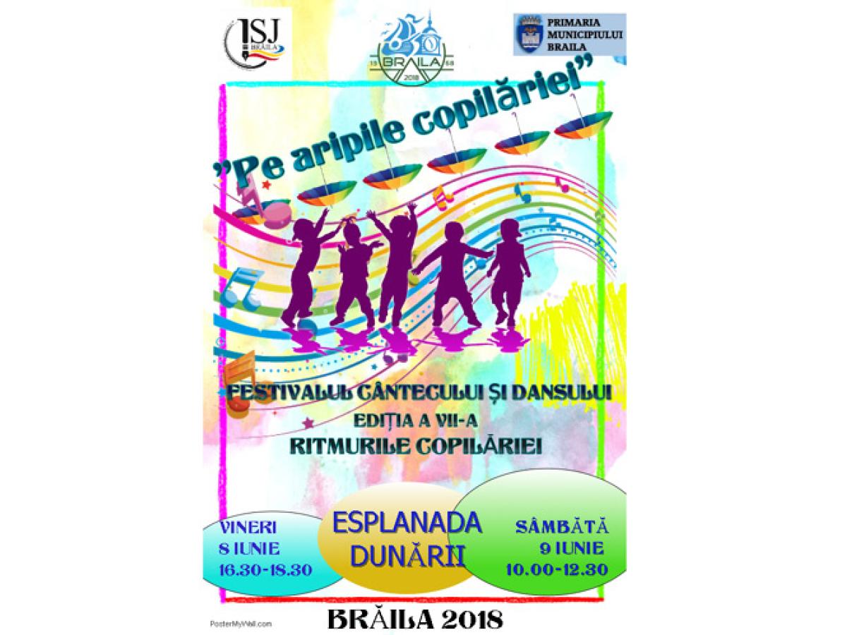 Seria evenimentelor începe cu Festivalul “Pe aripile copilăriei”. Astăzi şi mâine, brăilenii sunt aşteptaţi pe Faleza Dunării, la scenă, pentru a-şi aduce aminte de anii cei mai frumoşi din viaţa unui om: copilăria. Festivalul a ajuns la cea de-a şaptea ediţie, iar peste 950 de preşcolari de la 59 de grupe de grădiniţă din municipiu şi judeţ s-au înscris cu nerăbdare la cel mai aşteptat eveniment anual care ne poartă pe aripile copilăriei. Micuţii se vor întrece în paşi de dans, dar şi în talent muzical. Festivalul începe astăzi, la ora 16.30, iar mâine, programul artistic va continua de la ora 10.00. Evenimentul este organizat de Primăria Municipiului Brăila în parteneriat cu Inspectoratul Şcolar Judeţean Brăila.