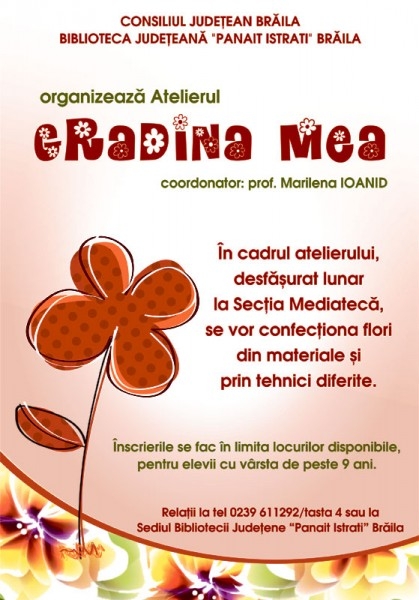Sâmbătă, la Biblioteca Judeţeană "Panait Istrati" Brăila are loc prima întâlnire în cadrul Atelierului creativ "Grădina Mea". Evenimentul va începe la ora 10.00, iar activitatea va fi coordonată de Marilena Ioanid, profesor şi artist plastic.