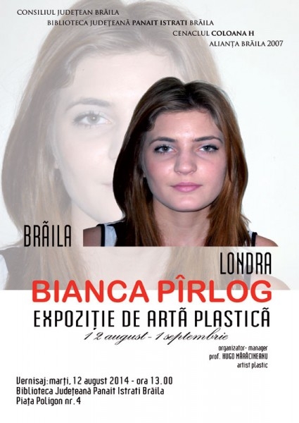 Astăzi, de la ora 13.00, la Biblioteca Judeţeană "Panait Istrati" se va vernisa expoziţia "Brăila - Londra" semnată de Bianca Pîrlog, absolventă a Colegiului de grafică şi design West Thames din Londra. Tânăra a fost descoperită pe când avea patru ani de către artistul plastic şi profesorul Hugo Mărăcineanu, care i-a organizat o expoziţie personală la numai cinci ani, considerând-o un copil minune. Ea a frecventat cenaclul "Coloana H" şi a participat la peste 100 de manifestări artistice naţionale dar şi internaţionale din: Japonia (Kanagawa), Finlanda (Turcu), Polonia şi Macedonia, unde a fost răsplătită cu menţiuni şi premii. După concursuri internaţionale şi expoziţii în Bucureşti la care s-a făcut remarcată, Bianca a primit invitaţii să expună în Europa de vest. Neavând posibilităţi financiare pentru a onora invitaţiile, dar fiind conştienţi de talentul ei, părinţii au decis să o ajute cum pot să profite de oportunităţi emigrând în Marea Britanie. La Londra, Bianca Pîrlog a fost admisă să studieze arta plastică la un colegiu de prestigiu. Drumurile sale s-au deschis după aceea şi mai mult şi fiind acceptată să expună la Gallery Art SUA din New York şi Londra. Lucrările ei au început apoi să fie prezentate pe site-uri celebre ca Satchi&Satchi şi Young Tate Gallery.