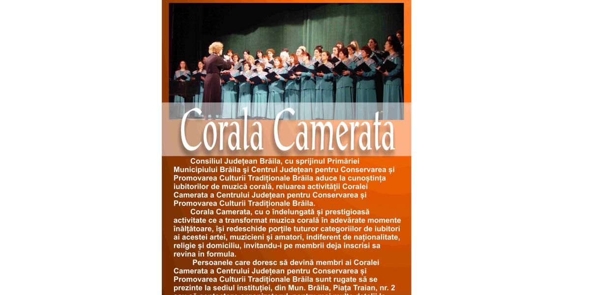 Iubitorii de muzică cultă, toți cei care doresc să devină membri ai Coralei Camerata a Centrului Județean pentru Conservarea și Promovarea Culturii Tradiționale Brăila sunt rugați să se prezinte la sediul instituției, din Piața Traian nr. 2 sau să contacteze organizatorul pentru mai multe detalii, la numărul de tel. 0239/614.710. email cult.traditional@gmail.com.