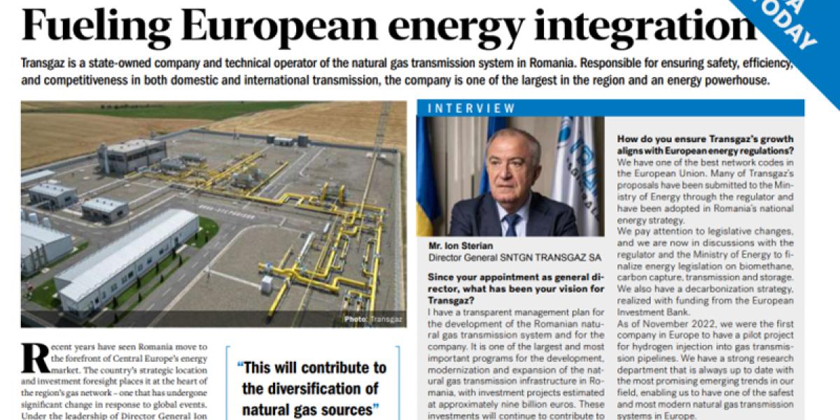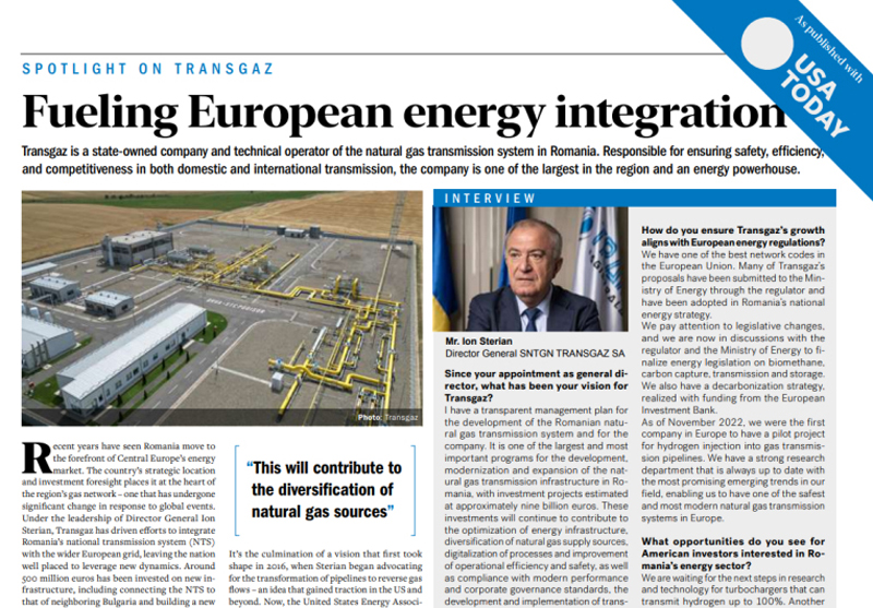 Ion Sterian: Avem unul dintre cele mai bune coduri de rețea din Uniunea Europeană. Multe dintre propunerile Transgaz au fost înaintate Ministerului Energiei prin autoritate de reglementare și au fost adoptate în strategia energetică națională a României. Acordăm atenție modificărilor legislative, iar acum suntem în discuții cu autoritatea de reglementare și Ministerul Energiei pentru a finaliza legislația energetică privind biometanul, captarea, transportul și stocarea carbonului. Avem și o strategie de decarbonizare, realizată cu finanțare de la Banca Europeană de Investiții. Din noiembrie 2022, am fost prima companie din Europa care a avut un proiect pilot pentru injectarea hidrogenului în conductele de transport de gaze. Avem un departament de cercetare puternic, care este mereu la curent cu cele mai promițătoare tendințe emergente din domeniul nostru, permițându-ne să avem unul dintre cele mai sigure și moderne sisteme de transport de gaze naturale din Europa.
