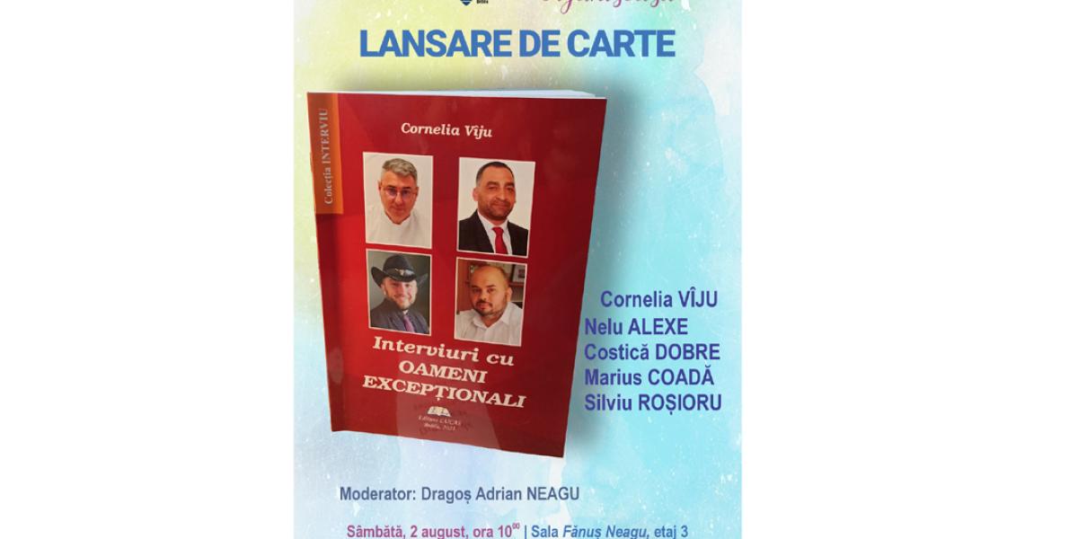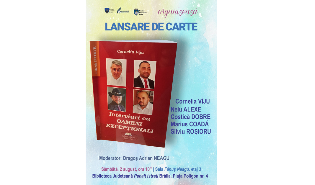 Sâmbătă, 2 august, începând cu ora 10.00, iubitorii de lectură sunt invitați la Biblioteca Județeană „Panait Istrati” (Piața Poligon nr. 4, etaj 3), la lansarea volumului semnat de Cornelia Vîju, „Interviuri cu oameni excepționali”, apărută, anul acesta, la Editura Lucas.
