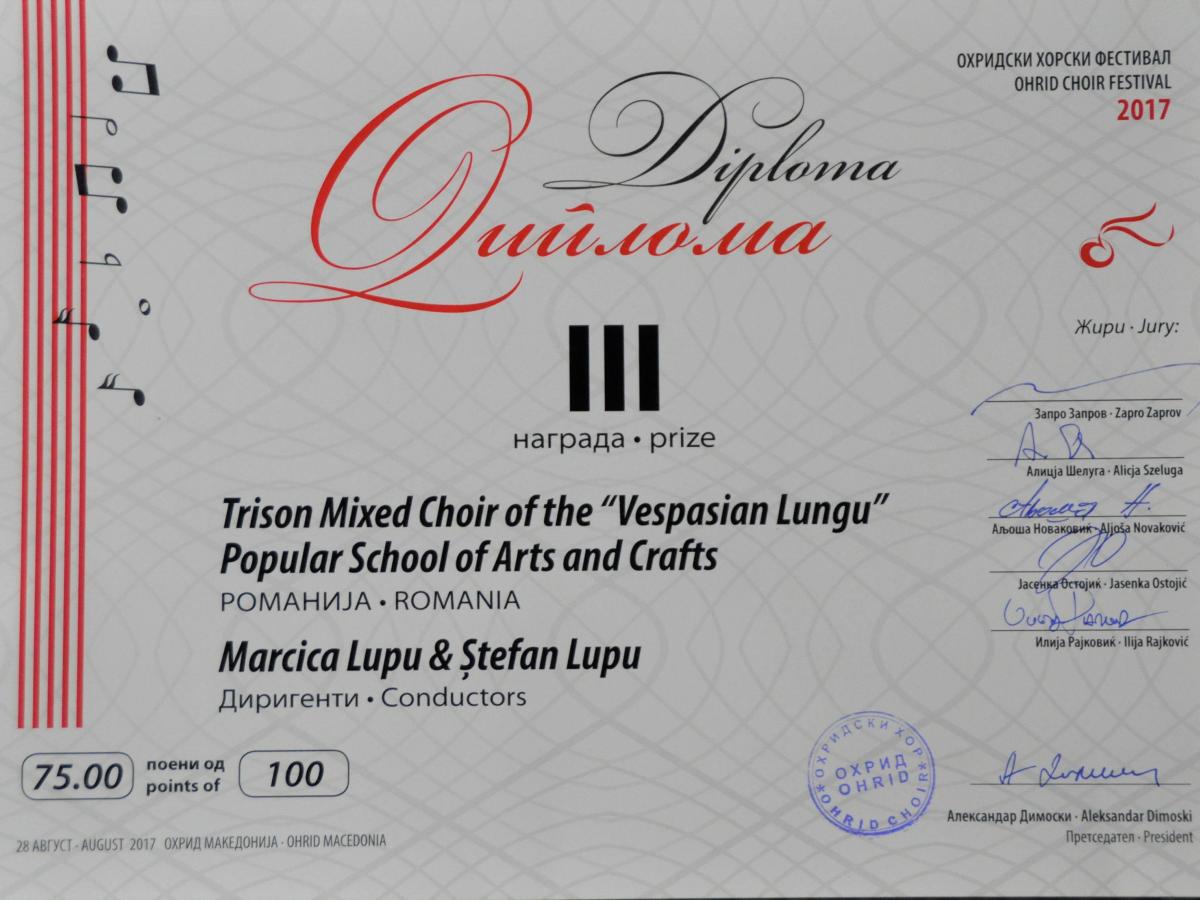 Corul mixt “Trison” din cadrul Şcolii Populare de Arte “Vespasian Lungu” Brăila a participat cu succes la Festivalul Coral Internaţional de la Ohrid, Macedonia.