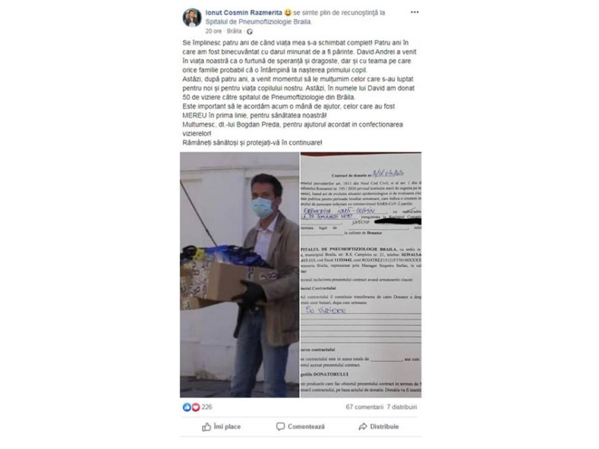 * coordonatorul Pro România Brăila, Cosmin Răzmeriță, a dorit să explice pe Facebook motivele pentru care a ales să facă donația către Spitalul de Pneumoftiziologie