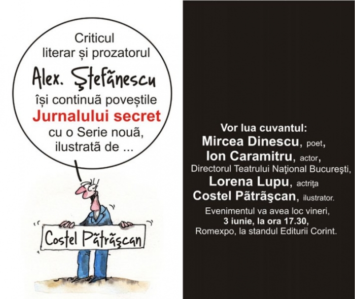 Astăzi, 3 iunie, caricaturistul Costel Pătrăşcan este prezent la Romexpo, unde va participa alături de nume importante ale culturii româneşti, la lansarea cărţii "JURNAL SECRET. SERIE NOUĂ", semnată de Alex Ştefănescu şi ilustrată de binecunoscutul umorist brăilean.