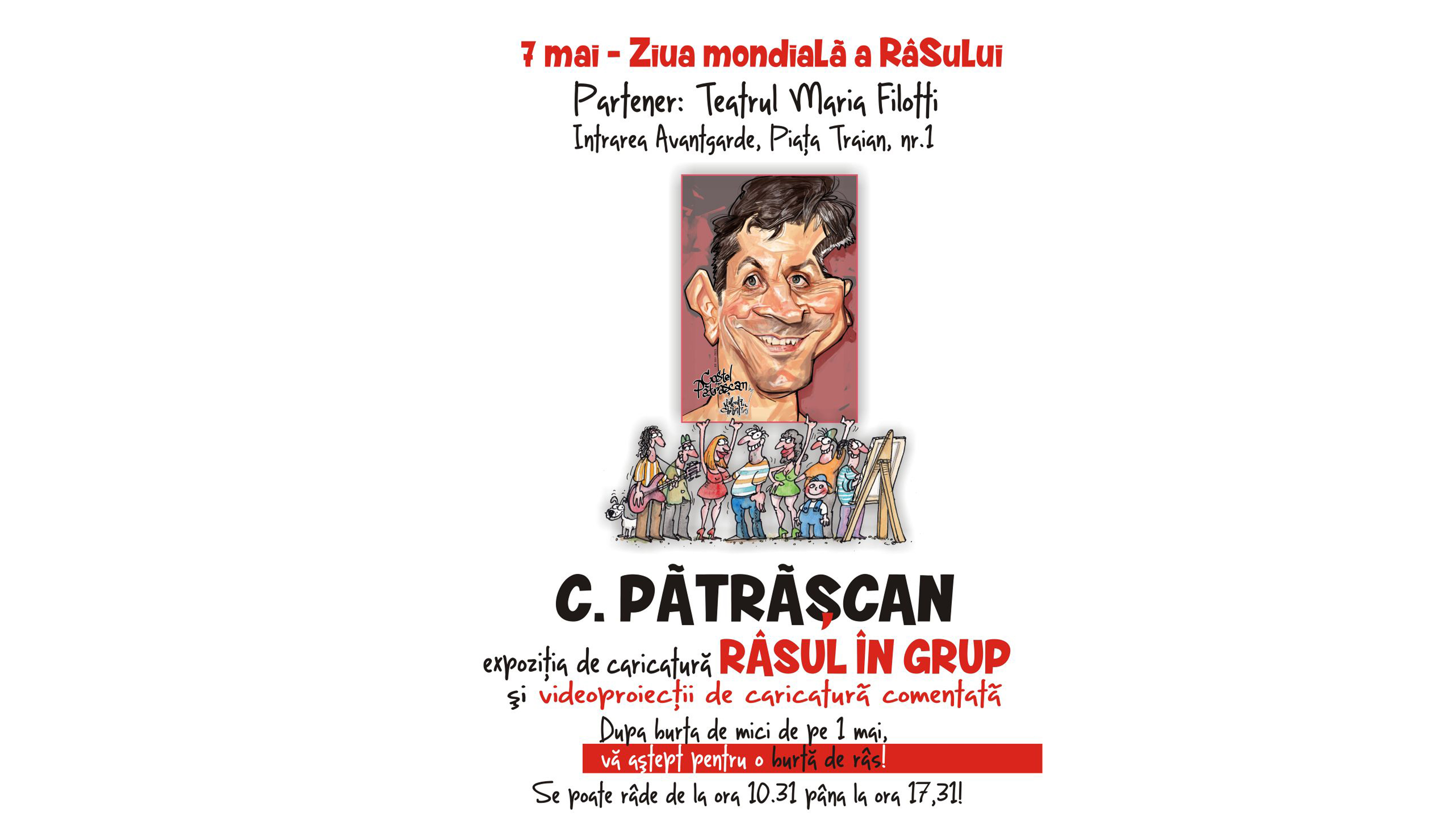După burta de mici, de 1 Mai, cunoscutul caricaturist Costel Pătrăşcan vă invită duminică, 7 mai, la un eveniment de tot hazul şi o burtă de râs. Cu prilejul Zilei Mondiale a Râsului, Costel Pătrăşcan vă propune să vă destindeţi cu o expoziţie de caricatură, “Râsul în grup”, şi cu videoproiecţii de caricatură comentată. Se poate râde de la ora 10.31 până la ora 17.31. Totul în incinta Teatrului „Maria Filotti”, intrarea Avantgarde din Piaţa Traian nr.1. “Dacă orbul a nimerit Brăila, nu mă îndoiesc că veţi nimeri Teatrul Maria Filotti... Aştept brăilenii să râdă în faţă, să râdă în barbă, să râdă cu subînţeles, să râdă mânzeşte, să râdă strâmb, să râdă din inimă, să râdă în hohote... Cred că va fi de râsu' lumii! Pe 7 mai, de Ziua mondială a Râsului”, promite caricaturistul prin intermediul unui comunicat de presă.