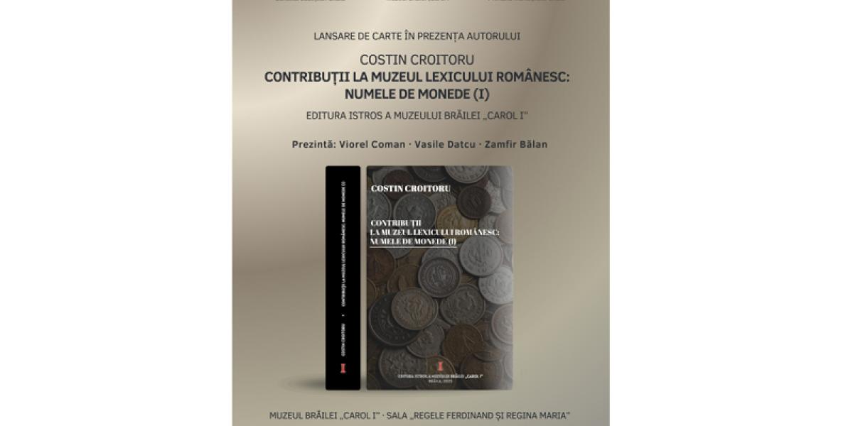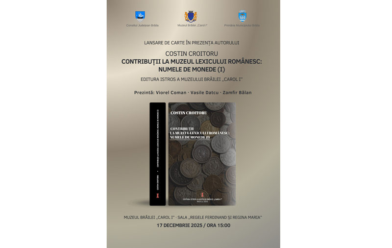 Miercuri, 17 decembrie 2025, la sediul central al Muzeului Brăilei „Carol I”, din Piața Traian nr. 3, Sala „Regele Ferdinand I și Regina Maria”, va avea loc, începând cu ora 15:00, lansarea cărții conf. univ. dr. Costin Croitoru: „Contribuții la muzeul lexicului românesc: numele de monede (I)”, apărută la Editura „Istros”.