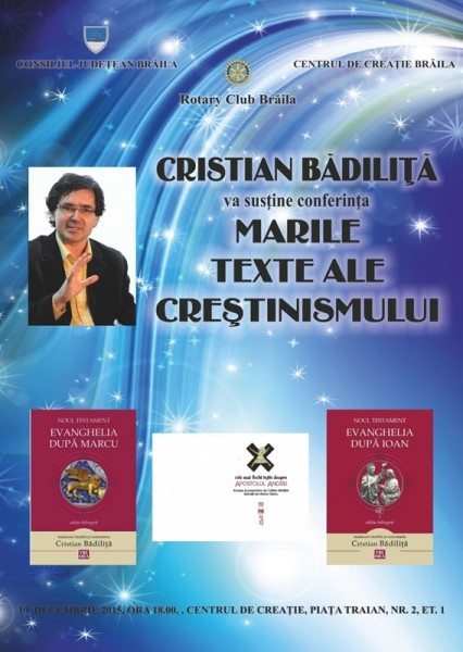 Teologul Cristian Bădiliţă se va afla, astăzi, la Brăila pentru a susţine o conferinţă despre "Marile Texte ale Creştinismului". Evenimentul va avea loc la ora 18:00 la Centrul de Creaţie (Piaţa Traian, nr.2) şi se anunţă unul extrem de interesant. Bădiliţă este doctor în istoria creştinismului antic al Universităţii Paris IV Sorbona şi cunoscut ca prieten al Brăilei. "Trebuie să recunoaştem că nu-i puţin lucru! Vă invit să câştigăm o oră din viaţă", a declarat caricaturistul Costel Pătrăşcan, implicat în vizita lui Bădiliţă în oraşul nostru. Trebuie precizat că Bădiliţă s-a născut în oraşul Săveni, judeţul Botoşani, unde a locuit până la vârsta de 14 ani. Apoi s-a stabilit la Botoşani, urmând liceul August Treboniu Laurian, secţia matematică-fizică. A debutat în revista Ateneu, suplimentul "Caiete botoşănene", cu poeme, în 1984. Al doilea debut, tot cu poezie, a avut loc în revista ieşeană "Cronica", în 1986. A urmat doi ani cursurile Facultăţii de Litere a Universităţii din Bucureşti, secţia română-franceză. În 1991-1992 a studiat teologia la Seminario Conciliar din Madrid. A predat limba şi literatura greacă veche la Universitatea din Timişoara. Între 1995-2001 a locuit în Franţa.