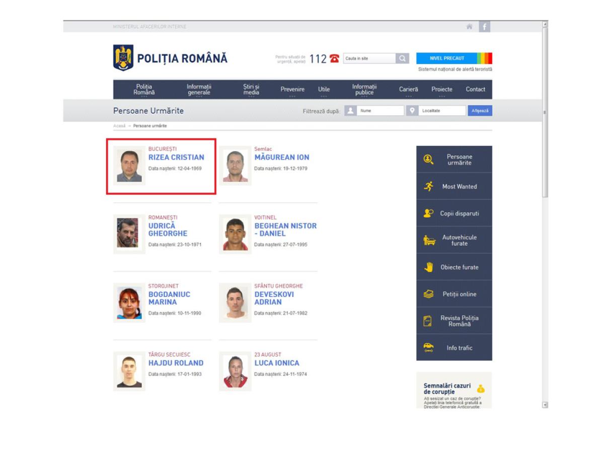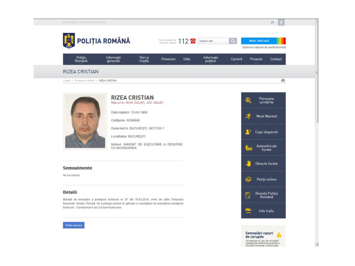 De la fotografii pe bannere în campanii electorale pentru Parlamentul României, la fotografii pe pagini cu urmăriţi internaţional pe site-ul Poliţiei - cam aşa s-ar putea descrie în câteva cuvinte traiectoria carierei politice şi nu numai a fostului deputat PSD Brăila, Cristian Rizea. Numele acestuia este cel mai recent adăugat pe lista persoanelor urmărite de Poliţia Română la nivel internaţional. Asta, după ce fostul parlamentar a fost condamnat definitiv, pe 18 martie, de Înalta Curte de Casaţie şi Justiţie (ÎCCJ), la 4 ani şi 8 luni închisoare cu executare pentru trafic de influenţă, spălare de bani şi influenţarea declaraţiilor. După cum s-a precizat în presa centrală, plecându-se de la declaraţiile avocatului său, Rizea s-ar afla în prezent la nişte rude în Statele Unite ale Americii, iar potrivit datelor publicate de Poliţia Română acesta s-a sustras punerii în aplicare a pedepsei cu închisoarea. Revenind la faptul că este urmărit de poliţişti, deşi pe site-ul Interpolului încă nu au fost publicate date despre fostul deputat, pe site-ul Poliţiei Române i-a fost realizat profilul, sub motivarea: “Mandat de executare a pedepsei cu închisoarea”. Practic, pe lângă o fotografie, cel mai probabil cea din cartea de identitate a lui Rizea, poliţiştii au adăugat şi faptul că acesta este născut în Municipiul Galaţi, pe 12 aprilie 1969, dar domiciliat în Bucureşti, Sector 1. La rubrica “Semnalmente”, poliţiştii precizează că nu se cunosc date în acest sens deocamdată. Cât despre acţiunile care au condus la punerea lui în urmărire, oamenii legii amintesc mandatul de executare a pedepsei închisorii nr. 87 din 18.03.2019, emis de către Tribunalul Bucureşti - Secţia I Penală, dar şi faptul că Rizea s-a sustras punerii în aplicare a acestuia.